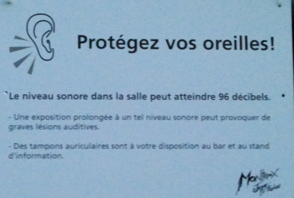 J’aime bien la musique du festival. Mais c’est trop fort à mon avis. On doit se placer loin, mettre de la protection anti-bruit dans les oreilles ou tu as un acouphène après le concert. J’ai vu cet enseigne près de la scène: